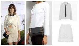 Alexa’s loosely knotted two-tone shirt?is the perfect foil for this ladylike lace white mini. Add a cross-body bag and the whole effect is pleasingly slouchy meets formal.