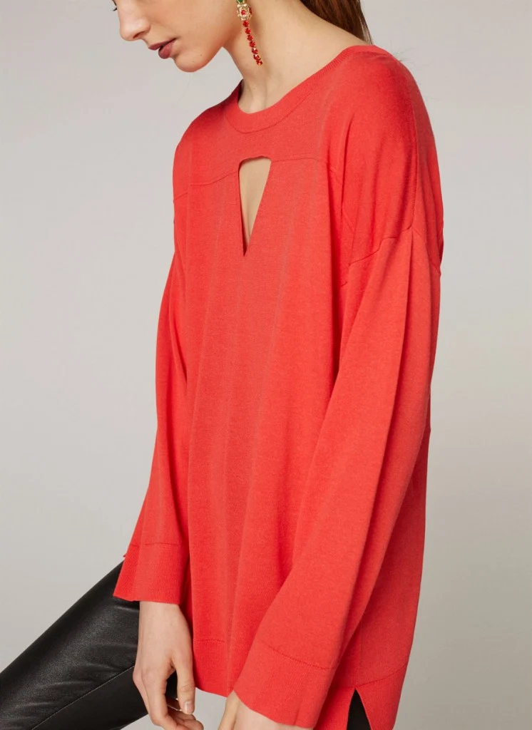 This deep shade of coral is flattering on every skin tone. I love the simplicity of this piece, the’subtle cut-out at the front?elevating it and making it a fashion piece rather than just a lovely sweater.