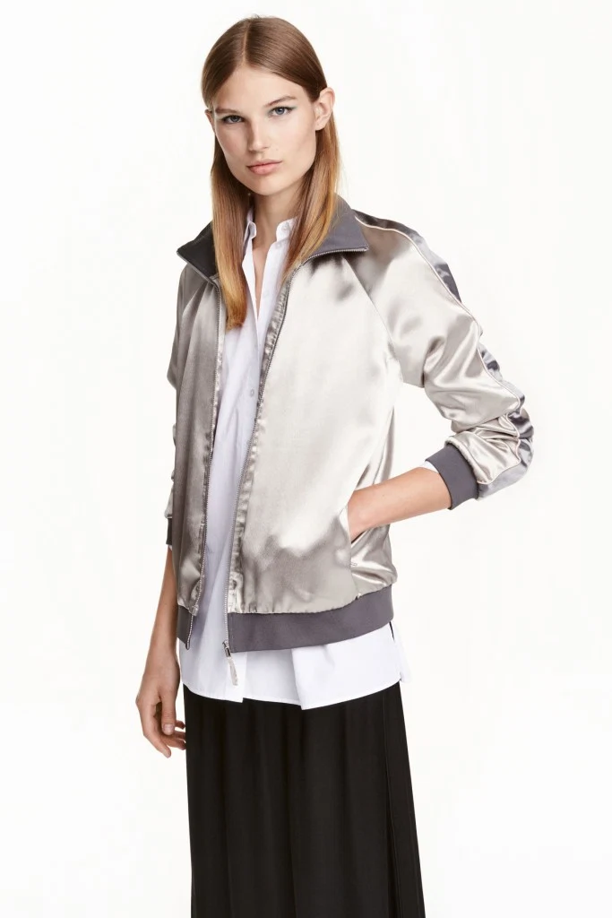 Sportswear always feels quite’spring-like, especially in a soft shade of silver. Trade your black puffa for this lightweight athleisure-style top.