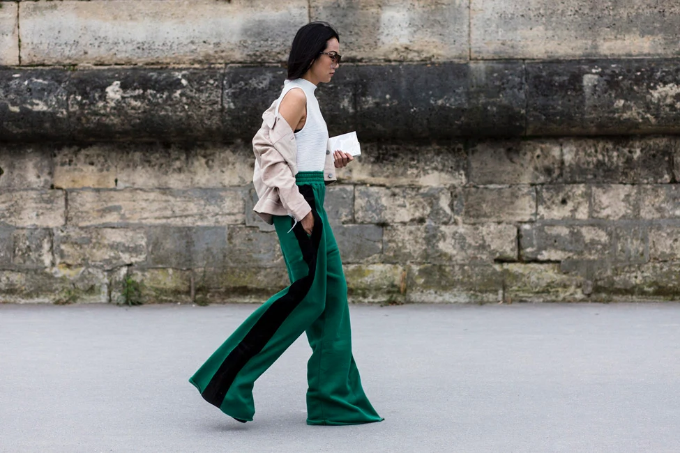 Wide-leg trousers look ultra-cool when you move. Pair with a boxy clutch to keep things feeling smart.