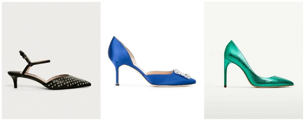 Studded slingbacks, €110 at Uterq?e. Hangisido pumps, Manolo Blahnik, €860 at Farfetch.?Metallic green court shoe, €39.95 at Zara.