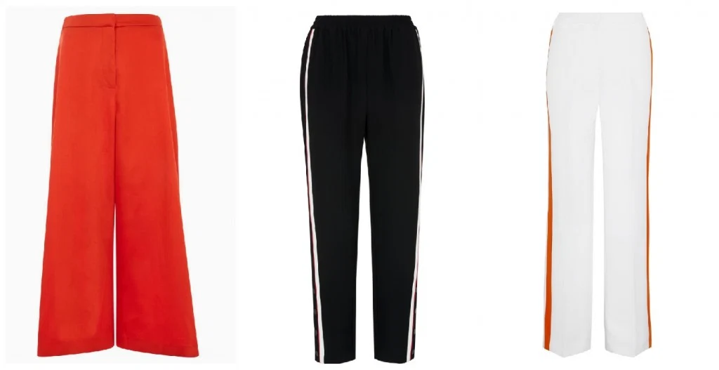 Popper side trousers, Boutique, €125 at Topshop.?Popper side striped trouser, €155 at Whistles.?Striped crepe wide-leg pants, Victoria, Victoria Beckham, €565 at Net-A-Porter.
