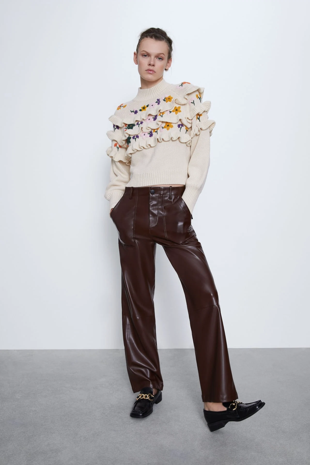 Embroidered sweater with ruffles, €49.95 from Zara