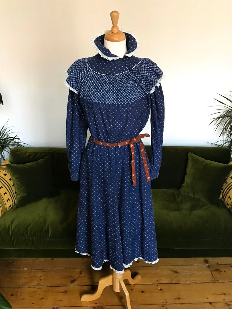 1970s blue midi prairie dress, size 10, €26.68 available from Etsy