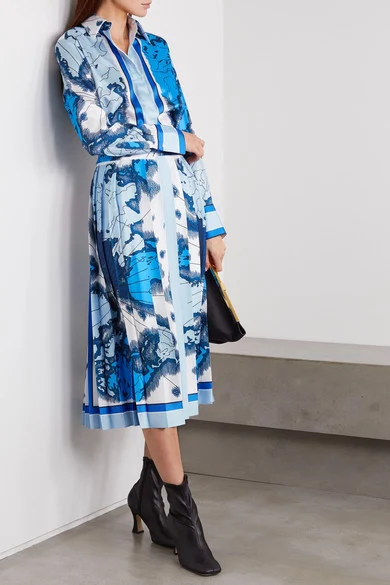 Victoria, Victoria Beckham printed satin-twill shirt, €330.28 and midi skirt, €381.80 from Net-a-Porter