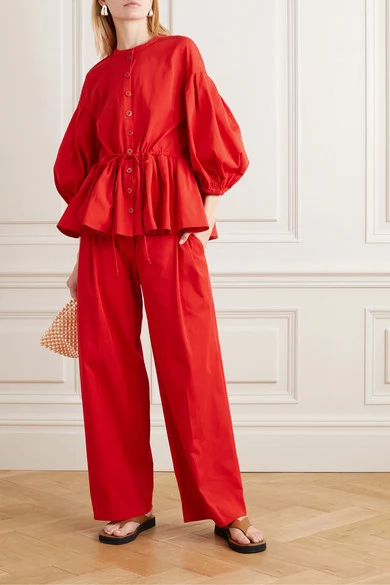 Stine Goya Ferrah cotton-blend jersey peplum blouse, €295.89 and Chet pleated stretch-cotton wide-leg pants, €273.13 from Net-a-Porter