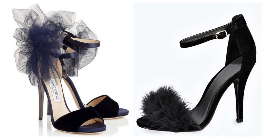 Lilyth 120 peep toe,??695, Jimmy Choo – Fifi Faux Fur peep toe, €30, Boohoo.com