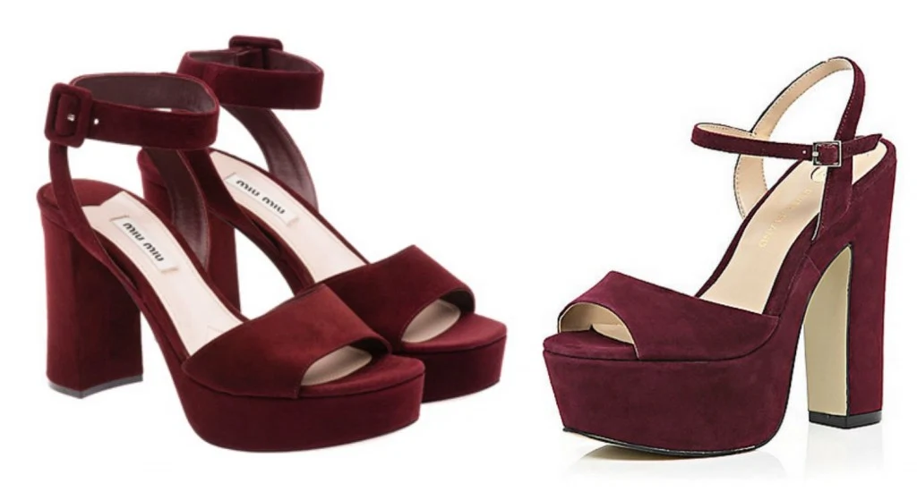 Suede Sandals, €495, Miu Miu – Suede Platform Heels, €55, Riverisland.com