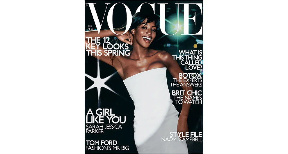 Having first appeared in Vogue in 1988, Naomi Campbell was well cemented as a cover star when Mario Testino shot her for the February 2001 cover of the British edition. Campbell’s most iconic British Vogue cover is the 1990 group shot she shares with fellow models Linda Evangelista, Tatjana Patitz, Christy Turlington and Cindy Crawford, photographed by the late Peter Lindbergh.
