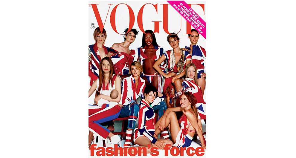 Mario Testino shot Kate Moss, Elizabeth Jagger, Erin O’Connor, Jacquetta Wheeler, Jade Parfitt, Jodie Kidd, Liberty Ross and many more influential British supermodels of the time for this cover which opened out as a spread.