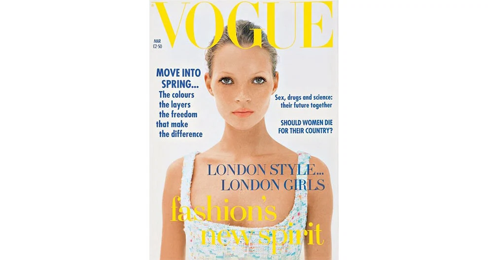 A 19-year-old Kate Moss landed her first ever British Vogue cover in March 1993, wearing Chanel and photographed by the late Corinne Day, who had previously photographed Moss in a feather headdress for the now iconic The Face cover in 1990.