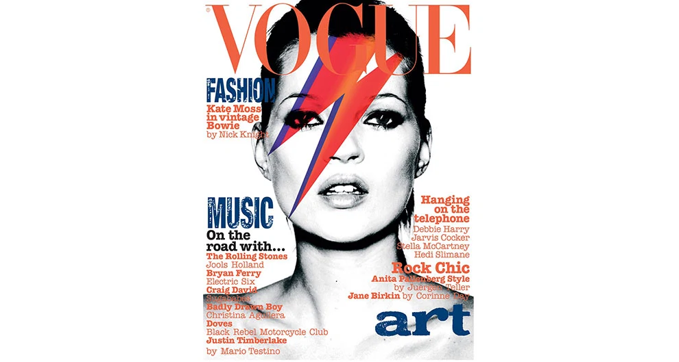 Kate Moss graced the cover of British Vogue in May 2003 dressed as David Bowie from the cover of his 1973 Aladdin Sane album. By then, Kate already had more British Vogue covers than any other model. As of June 2020, she has 40. Recalling the shoot, Alexandra said, “I love this because I’m a lifelong Bowie fan so it was my idea to do Kate Moss as Aladdin Sane – and it’s become one of the most reproduced covers of all time.”