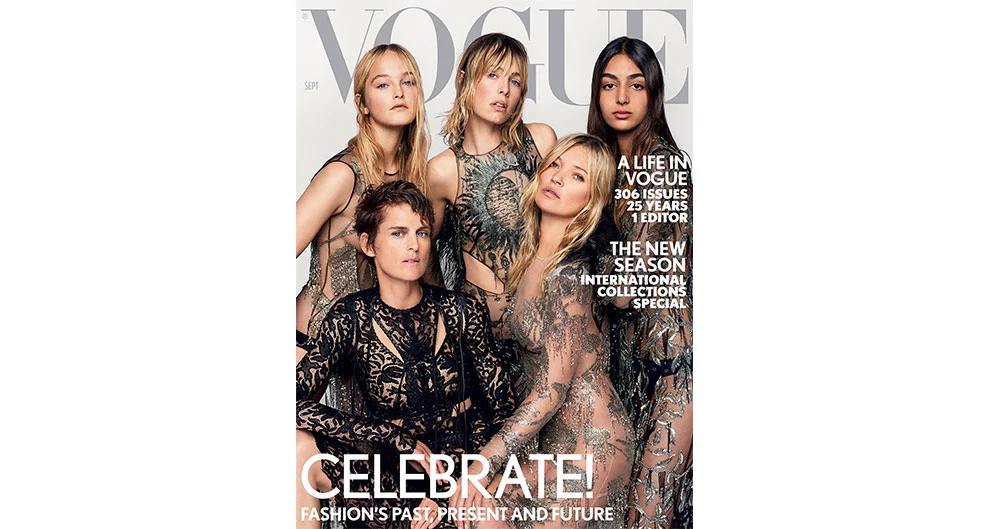 To mark the end of an era in British Vogue’s history, Alexandra chose models of the past and present including Kate Moss, Nora Attal, Edie Campbell, Jean Campbell and Stella Tennant for her final September issue – and final cover – ever, shot by Mario Testino. The formidable editor-in-chief passed the torch to Edward Enninful, who, in August 2017, was the first black man to edit British Vogue.