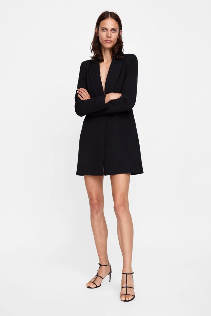 If you’re a fan of Meghan Markle’s style (and who isn’t?) then this is the dress for you. Similar to Markle’s tuxedo dress, it’s smart, sexy and very modern. It will work equally well with black opaque tights too.