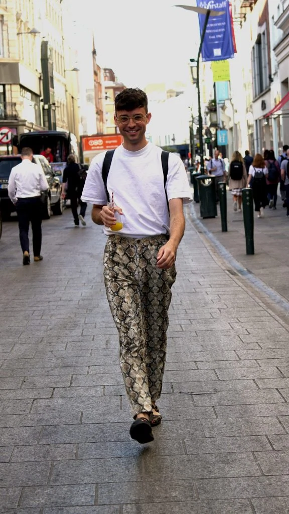 What he’s wearing: “I’m wearing Gucci sandals, snakeskin pants that I bought in a charity shop in America for $5, a white T-shirt from Urban Outfitters, glasses from Optica and a leather backpack from Gucci as well.”