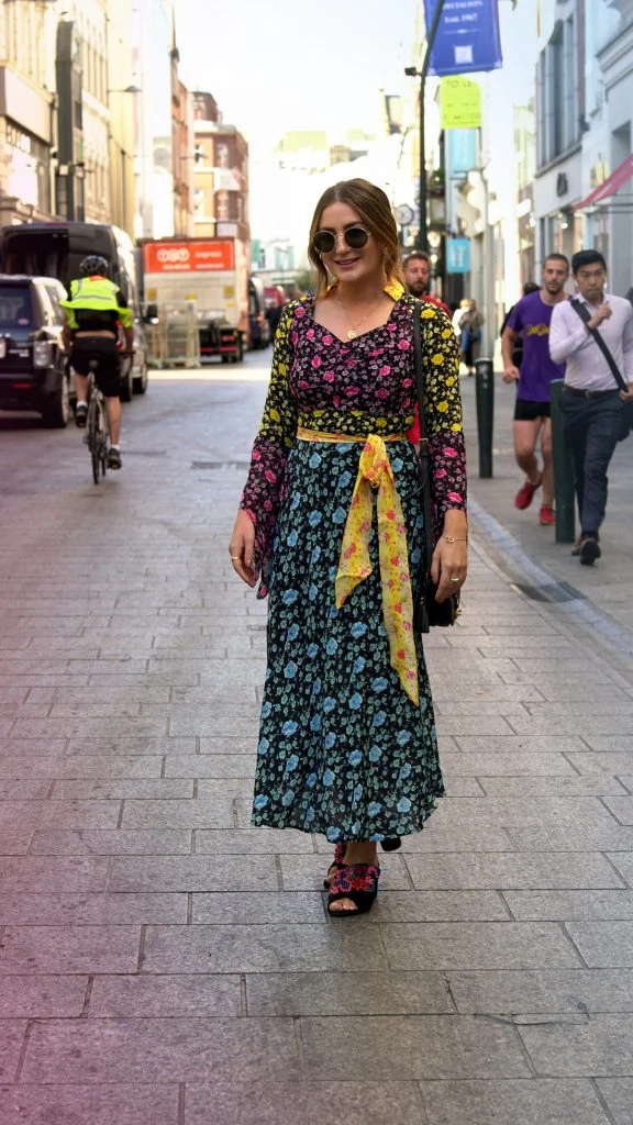 What she’s wearing: “I’m wearing a new-season Rixo floral dress, embellished mules from & Other Stories, a Louis Vuitton saddle bag and sunglasses from H&M (that are half-chewed by my dog!)”.