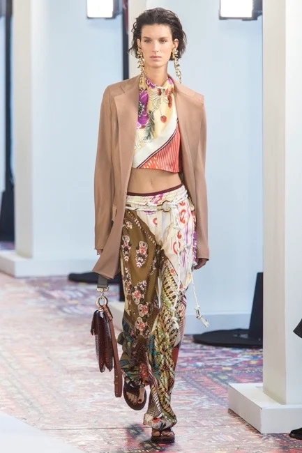 I admit I won’t be buying into the long tasselled earrings, rope belts or thick gold ankle cuffs; I played around with these items in the early noughties when Sienna Miller brought boho chic into every fashion-loving woman’s mind’s eye, and before I realised there was nothing remotely bohemian about me; not my look nor my attitude. But Chloé’s scarf-print midi skirts, longline blazers (I can be bohemian and wear a structured blazer?), balloon-sleeved blouses and body-skimming maxi dresses (very Victoria Beckham) spoke to me and my idea of city summer chic. The calf-length split-front trousers with oversized ribbed sweater was the collection’s standout outfit in my mind, and if I had the body to support the drape of an exquisite sand-coloured shirt dress, I’d be obsessing over that too. There’s nothing crusty or crumpled-looking about Chloé’s city hippie. She’s the relaxed but not gauche, smart but not stiff woman we all want to be in the easy breezy days of summer.