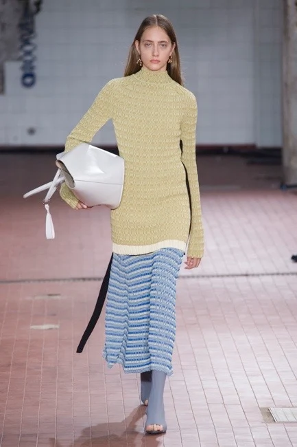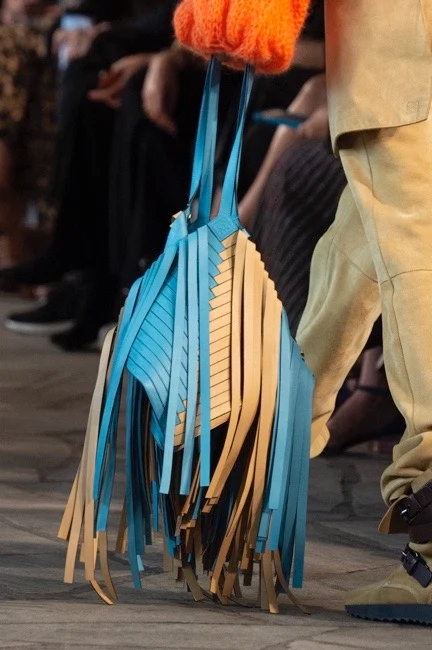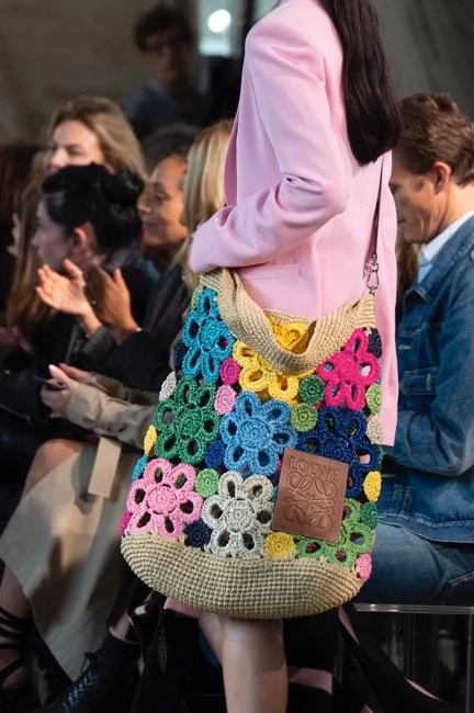At Loewe, JW Anderson had similar ideas, describing his collection as “free” and “sensual”. These boho vibes were manifested in fit-and-flare patchwork dresses that were grown-up rather than grungy, oversized tactile cable-knit sweaters that looked sexy rather than circusy, and giant fully fringed bags that made this slightly tired old micro-trend feel utterly cool and covetable. The crossbody crochet floral bag could have felt twee, but paired with a pink tailored jacket, masculine shirt and varsity-inspired sweater, it looked fresh and made the entire outfit feel unexpected and modern.