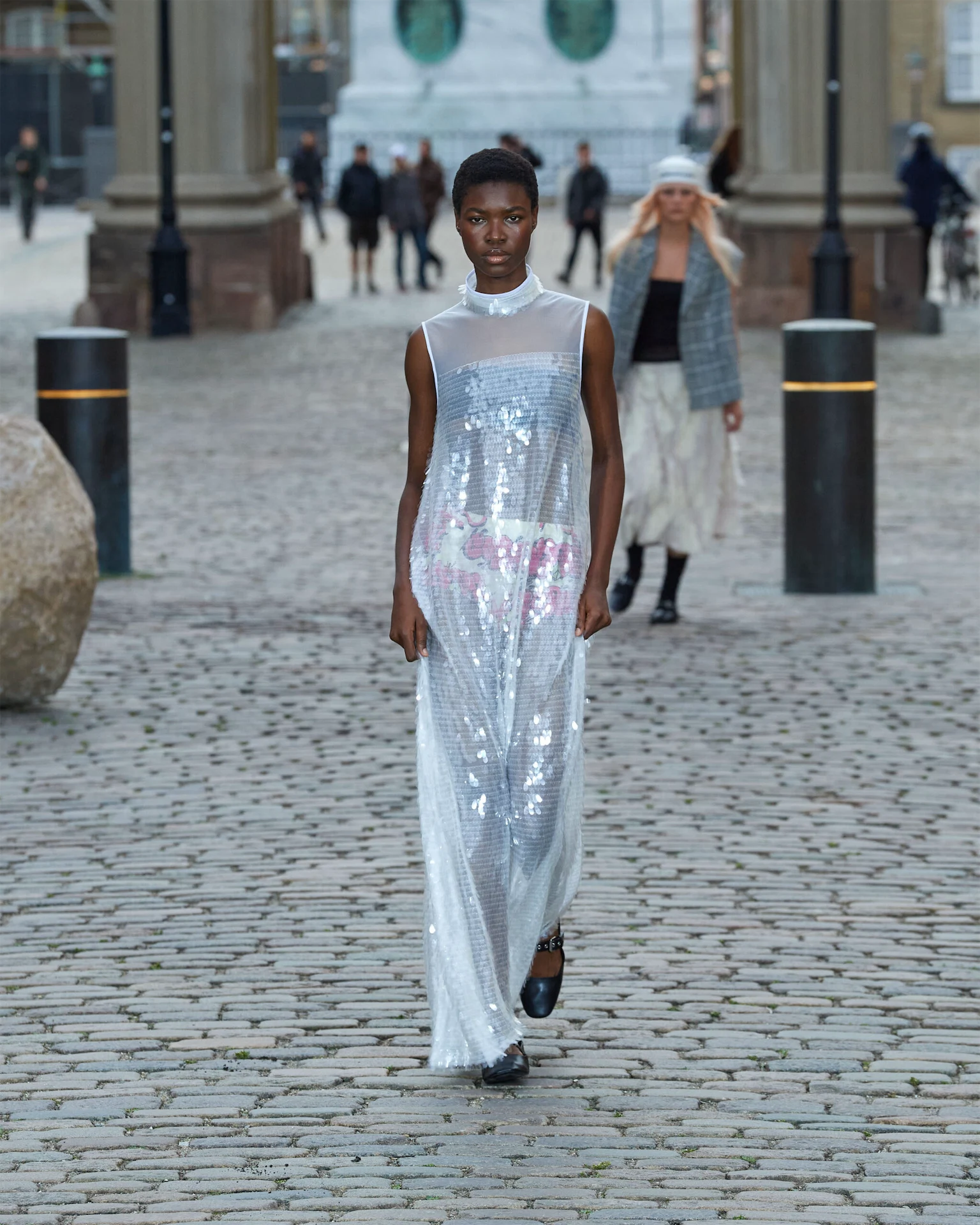 Cobblestone catwalks, and rain-soaked front rows, were a theme at Copenhagen Fashion Week. Baum Und Pftedgarten, A. Roege Hove, and Skall Studio staged outdoor shows in the wet weather, with models navigating the tricky terrain of slippery stones and show-goers sheltering under umbrellas. Drizzly moments also dominated the Marimekko show on Denmark’s design museum grounds. Minimalist silhouettes were decorated with bright, bold oversized florals, while easy co-ords in towelling fabrics stood out among the grassy terrain.