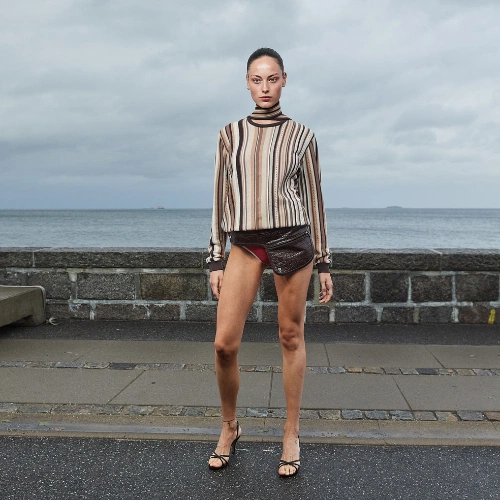 Merging indoors and outdoors in Zalando’s official venue was Paolina Russo. The Central Saint Martin graduates, Lucile Guilmard and Paolina Russo, were awarded the first Zalando Visionary Award and debuted at Copenhagen Fashion Week. In partnership with CPHFW, the award focuses on sustainable practices and awards the design duo €50,000 and coveted billing at CPHFW. “We are truly thrilled to have been part of Copenhagen Fashion Week as winners of the Zalando Visionary Award – to share and celebrate our work with a large audience is an incredible opportunity. Meeting the high standards of an award like this brings us closer to our goal to modernise craftsmanship and rethink traditional techniques through innovation and fashion that is more responsible,” said Paolina Russo and Lucile Guilmard, Co-Creative Directors. Rune-carved rainbow floors and a stone circle centrepiece decorated an ample warehouse space, evoking folklore inspiration. A diverse cast of models dressed in distressed denim, sun-bleached pastels, and signature knitted dresses circled the set before following the carpet outside.
