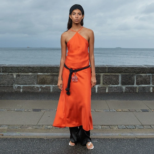 Stine Goya staged their show on Eckersbergade, Stine’s home street, with a show aptly entitled ‘Homecoming.’ Rain-soaked benches were lined up in front of white picket fences, with rain showers clearing in time for models to emerge from various townhouses. Neighbours peered from the windows and cheered from balconies. A long dinner table stretched the length of the runway with place settings provided by the street residents and was the backdrop to the finale, with the models sitting down to enjoy the wares. A strong showing of colour started the show with Barbiecore pink still reigning supreme elegant fashioned into sheer blouses, tailoring and slinky dresses. Although known for their prints, for spring, they were more refined, allowing the silhouettes to speak for themselves.