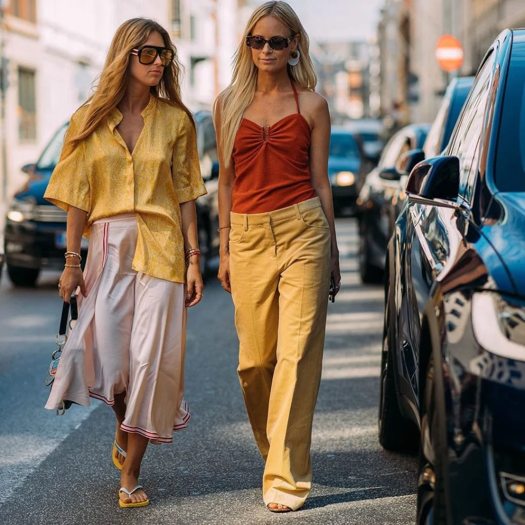 Who knew that your €24 pool-side sandals would ever be considered as the go-to fashion shoe? There’s nothing bawdy about this sleek satin and silk combination. The draping, laid-back silhouette is exactly what Emili Sindlev‘s Havianas needed to take this look from beach explorer to front row. It’s definitely not a #predictable approach to fashion week attire, but with the heat set to continue in the Danish capital, it’s a smart answer to keeping cool in style. I love how she accessorised with 80s-inspired Prada sunnies, arm bangles, long, beach-wave tresses and THE Dior saddle bag. Also, find yourself a friend who perfectly coordinates with you (and your Havianas).