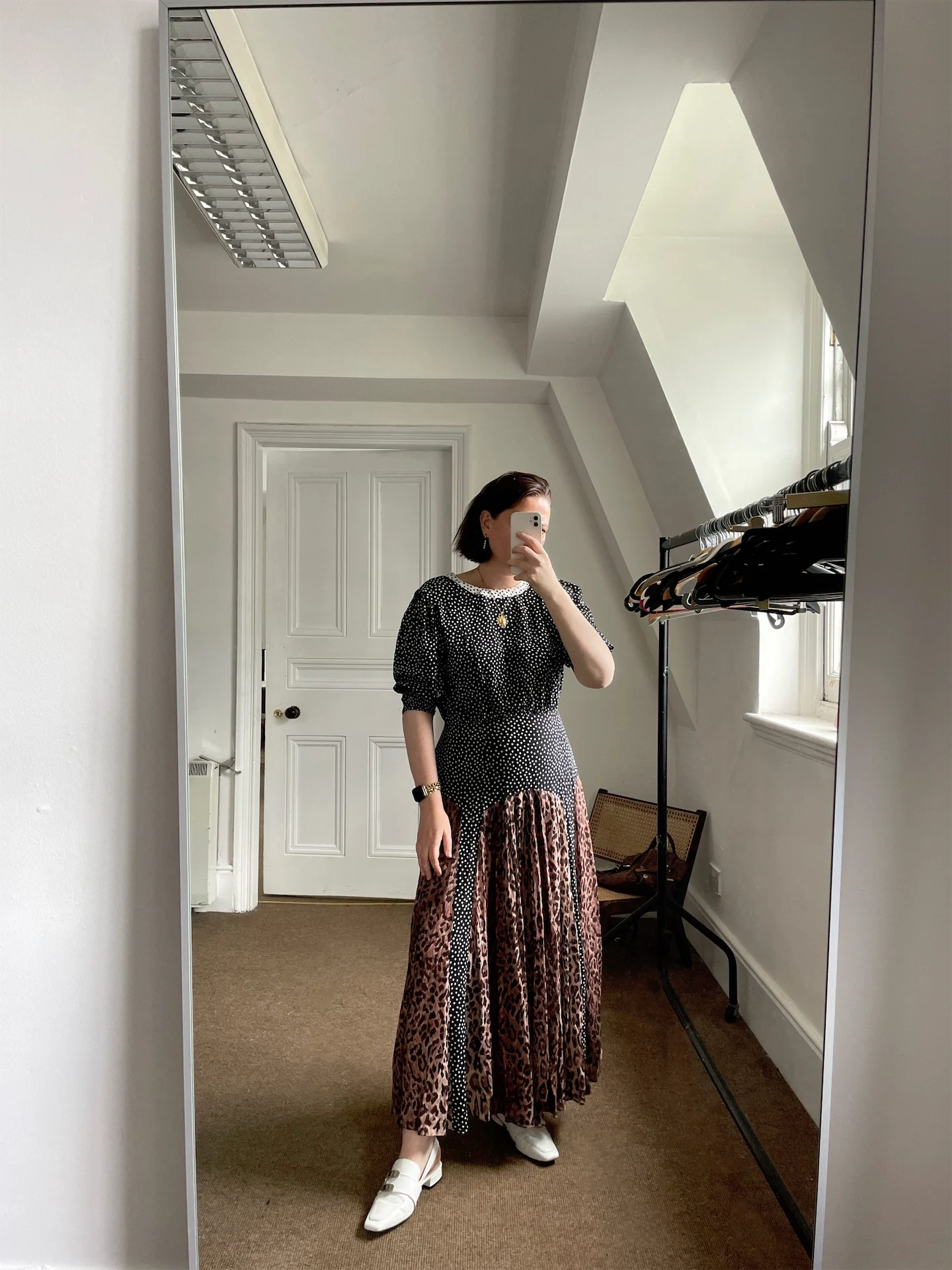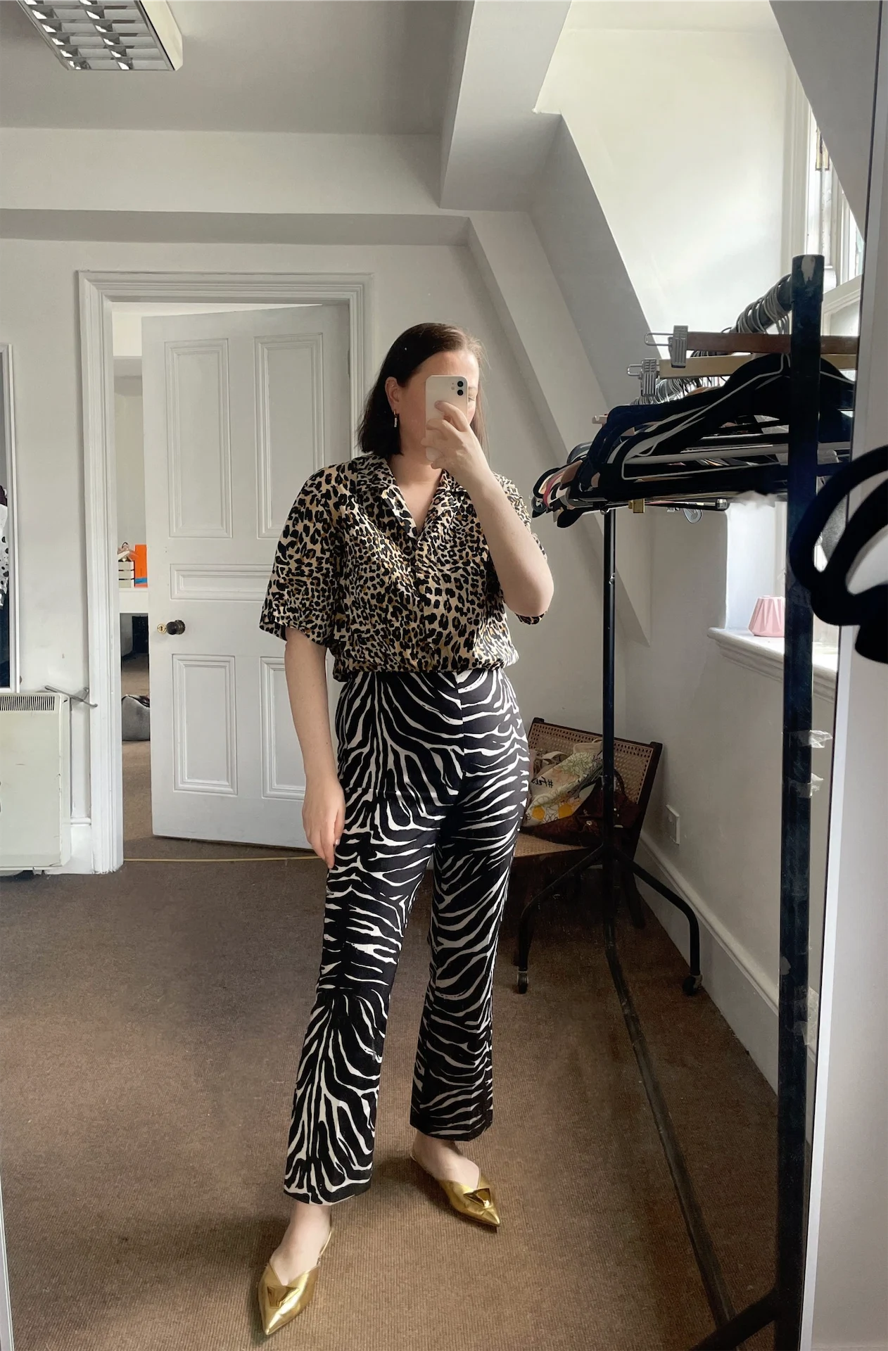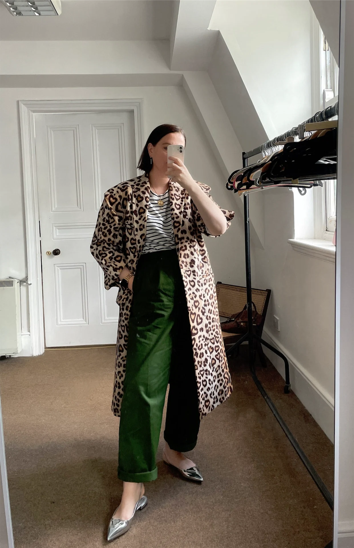 It’s an office day today; I’m recording a podcast, mood boarding for autumn and winter shoots and doing my VAT returns – the not-so-glamourous side of freelance and self-employed – the admin day! I’m wearing a shirt from Arket, trousers and shoes from Zara. I love animal print in general, and I’m never afraid to mix my prints; I just love how it can elevate a simple outfit of shirt and trousers into something more memorable. My job involves a lot of running around the shops so I tend to go for flats a lot of the time. I have an extensive selection of trainers, but I have always been obsessed with a pointy flat. It can look much more polished for the day than trainers, especially when I meet people.