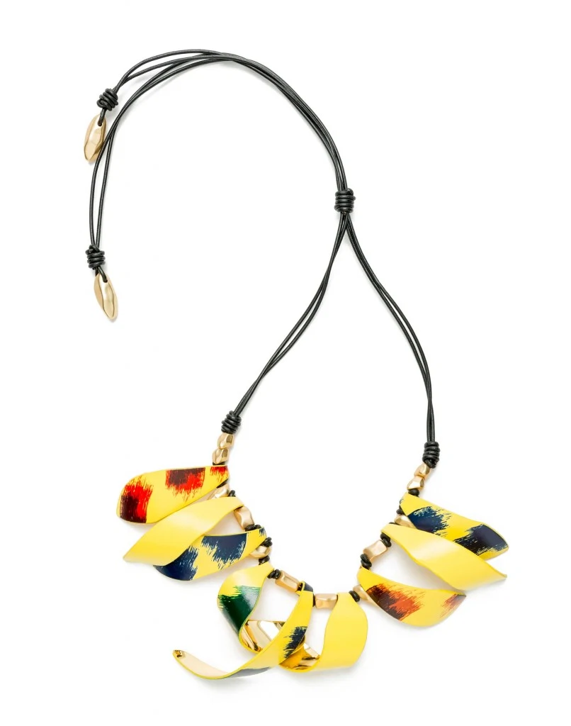 Spanish online retailer Bimba Y Lola is known for it’s quirky, vibrant designs. This neckpiece is fantastic. At first glance, I thought it was made from feathers, but it’s actually created?from leather shards. It’s contemporary without being minimalist.