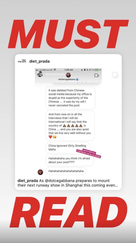 The video was posted ahead of the fashion house’s “Great Fashion Show” in Shanghai, a $12 million production that was abruptly cancelled following co-founder Stefano Gabbana posting racial slander on his personal social media. In screenshots posted by Diet Prada, the verified account of Stefano Gabbana is seen sending out messages which read, “From now on in all the interview that I will do international I will say that the country of [series of poop emojis] is China” and “China Ignorant Dirty Smelling Mafia,” among other insults.