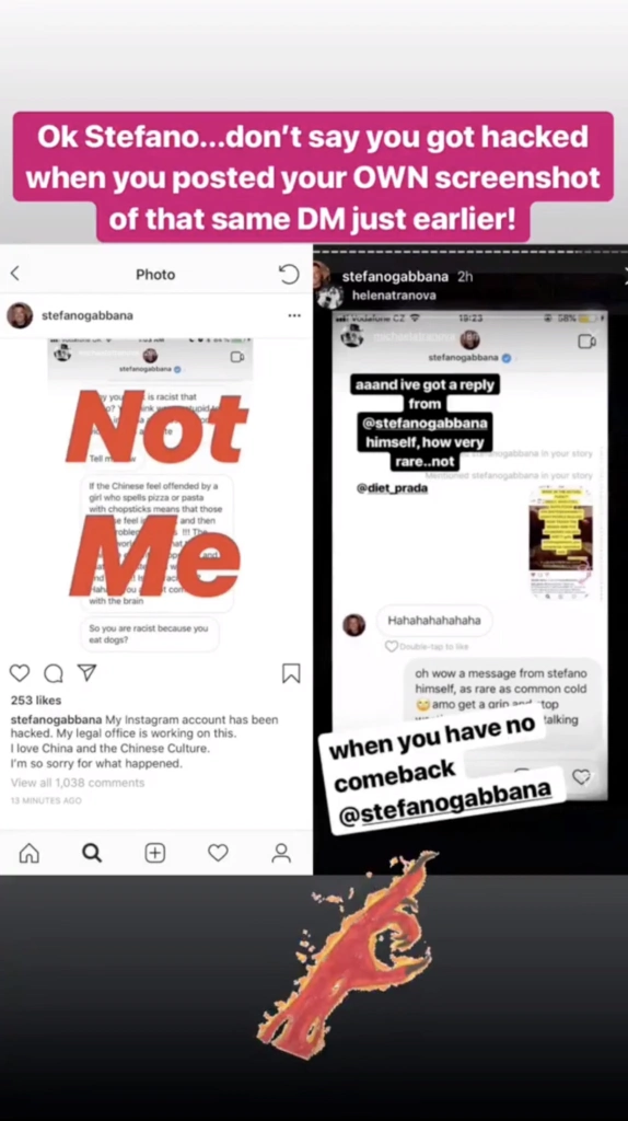 “My Instagram account has been hacked. My legal office is working on this. I love China and the Chinese culture. I’m so sorry for what happened,” Gabbana wrote on his personal page.