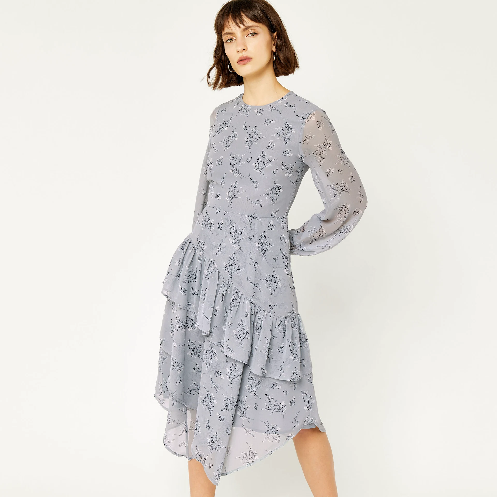 Long chiffon sleeves and asymmetric ruffles give this dress a very romantic vibe. The smoky shade of lilac adds a vintage feel to the piece too.