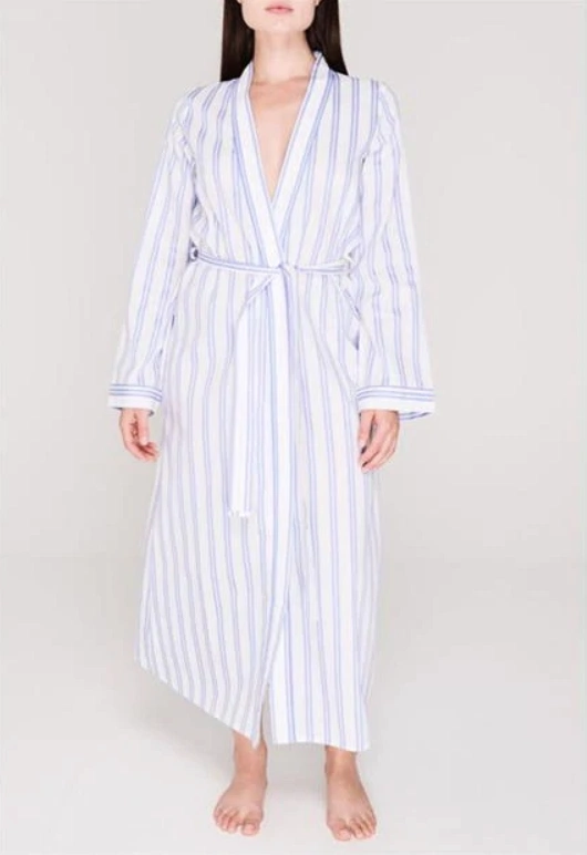 You you prefer something a little less sweet, this long line robe with a blue pinstripe captures the essence of pyjamas while still being feminine, and it’s made of crisp cotton so it will wash beautifully.
