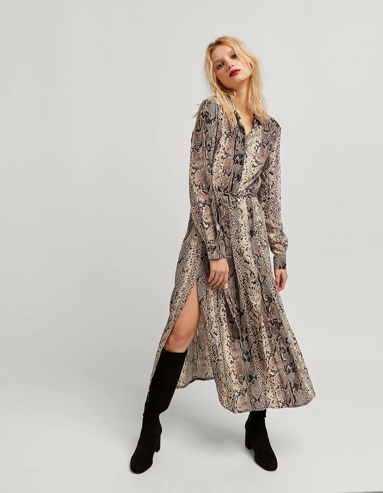 Long snakeskin dress with tie belt, €39.99