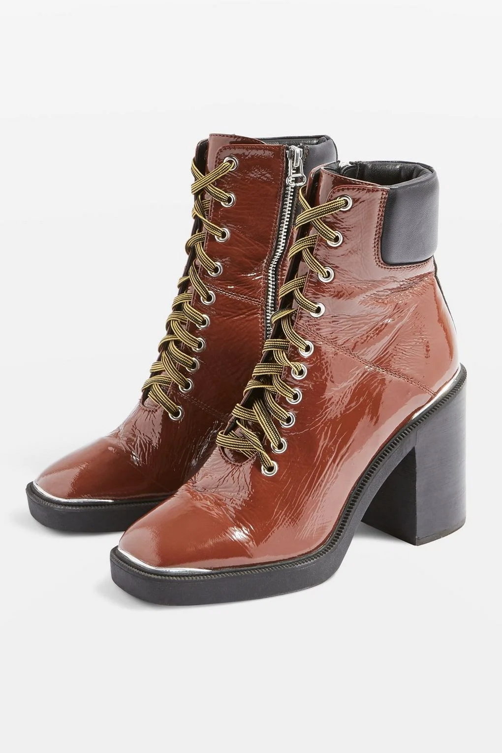 Mid-heel patent finish ankle boots, €35.99 at Bershka