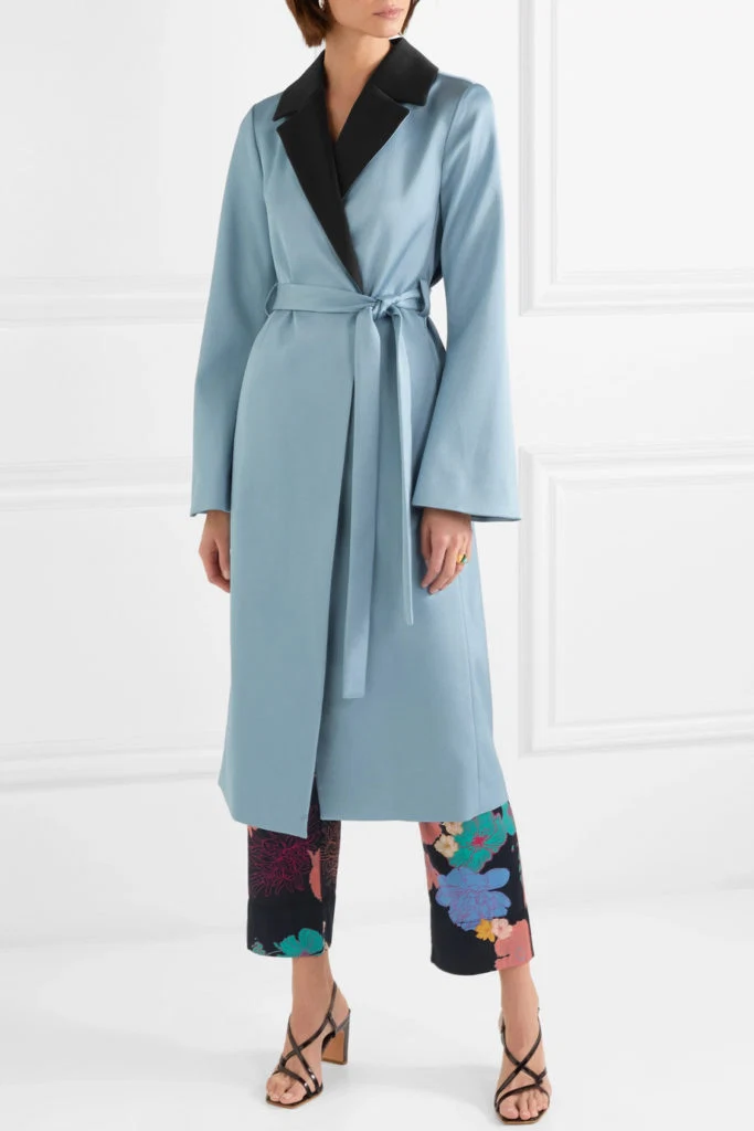 This dusty blue hammered-satin coat is exquisite and perfect for women who want their outerwear to express their femininity as much as the high heels or jewellery they choose. I love the complete lack of detailing; the contrast between the black lapels and soft shade of blue makes the perfect statement.