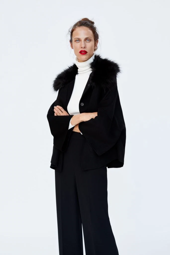 Black doesn’t have to mean boyish. This shorter-length cape with faux fur collar has something of Old Hollywood glamour about it. It’s elegant and refined and it will work for the office as much as an evening event.