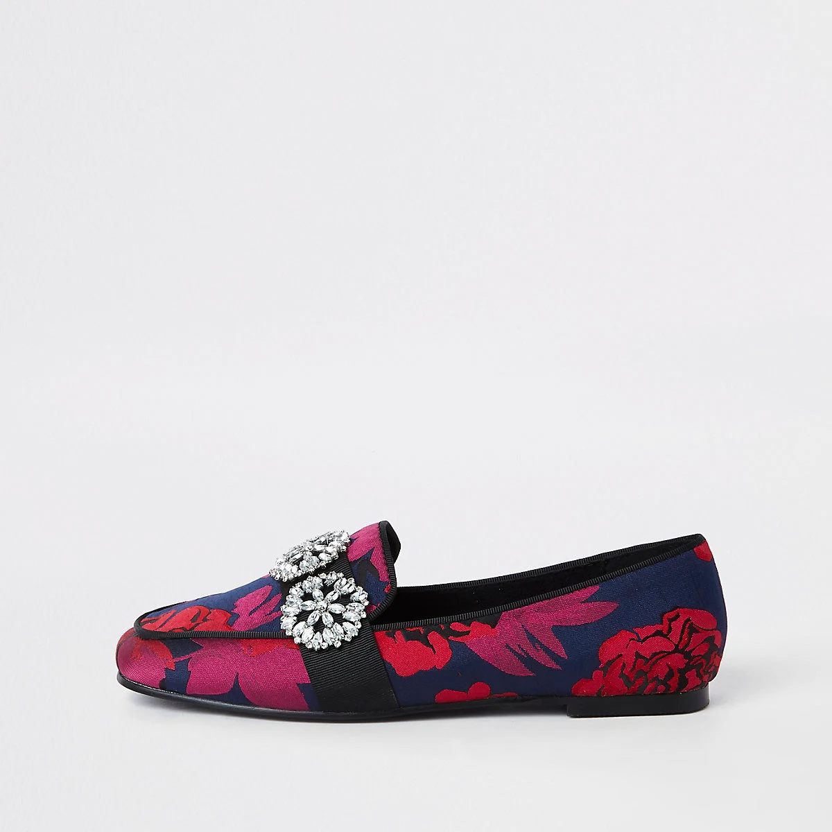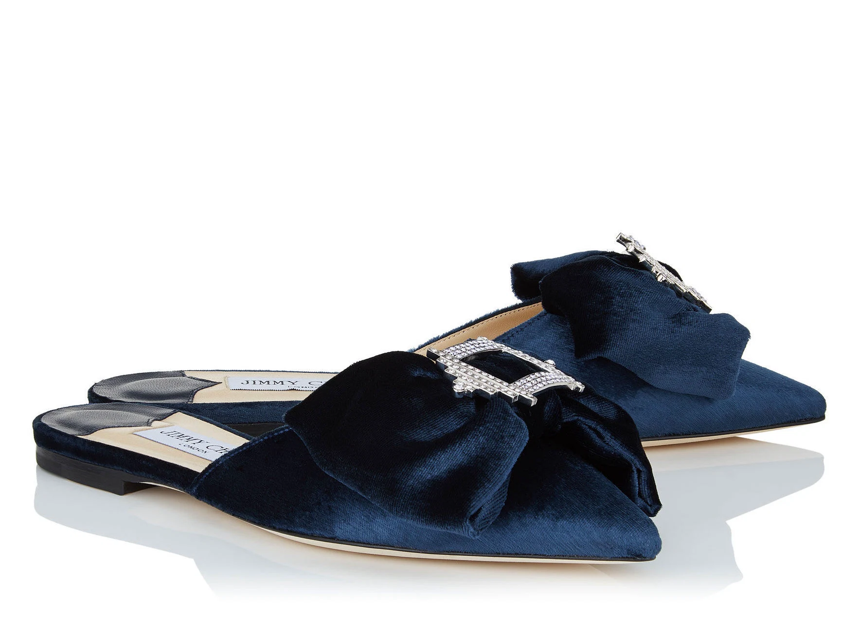 Navy liquid velvet pointy toe flats with jewel buckle detail, €625 at jimmychoo.com