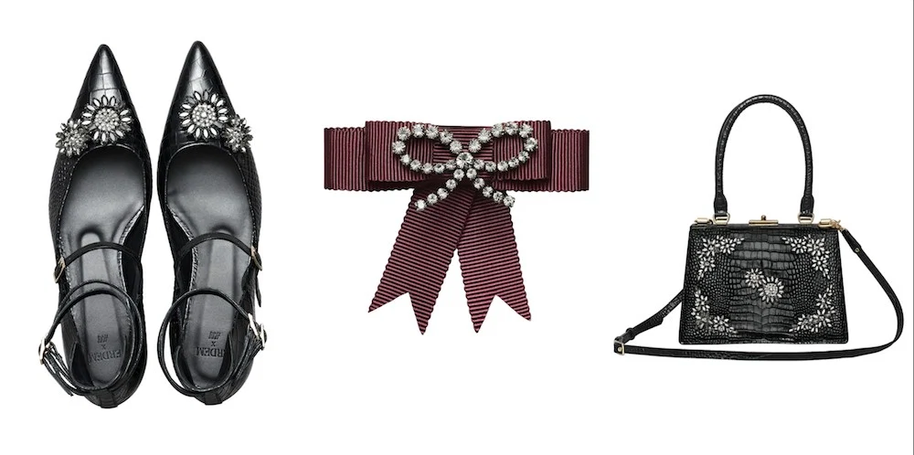Embellished shoe, €179, burgundy brooch, €24.99, embellished leather bag, €249