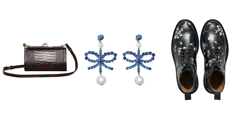 Burgundy leather bag, €200, crystal earrings with pearl detail, €34.99, leather boot with floral detail, €179