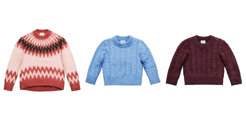 Stripe sweater, €99, blue sweater, €79.99, burgundy sweater, €79.99
