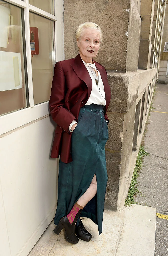 I’ve always thought Vivienne Westwood was the perfect example of a woman who has aged beautifully without sacrificing one iota of her personality or spirit. She wears her own avant-garde label better than any woman of any age. Of course, being a fashion designer she has a head start on the rest of us. She understands colour and texture, form and silhouette, and how they work together to create flattering outfits. The mix of burgundy and teal she’s wearing below looks fresh and modern but suits her colouring and her age beautifully. The tailoring is sophisticated, but contemporary too – she’s played cleverly with proportion by pairing a longline jacket with a maxi skirt. The platform shoes and patterned socks inject a flourish that is Westwood’s signature, and the slit in the skirt playfully says, I’m not finished yet! When I grow up, I want to be Vivienne Westwood.
