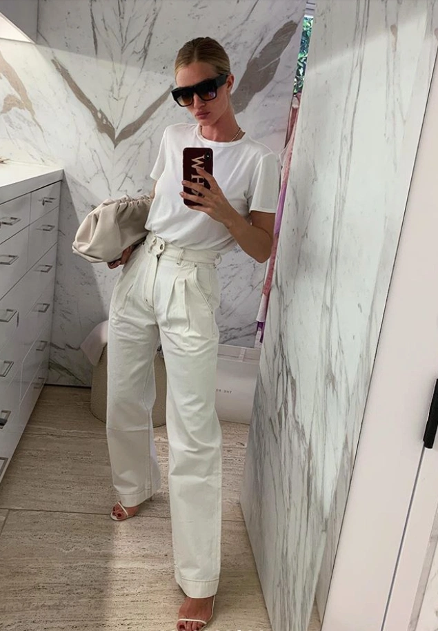 Those in the know on Instagram are already wearing the longer hem with attitude. Rosie Huntington Whitely – whose style is hitting new heights right now – wore a white, high-waisted pair, with on-trend strappy sandals and a white T-shirt.