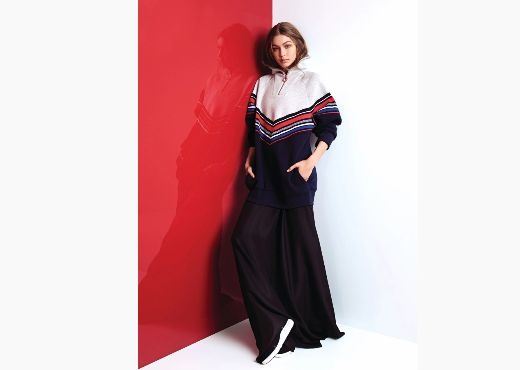 The looks are bold yet relaxed, with a playful fashion edge inspired by Gigi’s own effortless twist on athleisure style. Timeless classics, including oversized outerwear, tailored jeans, sporty activewear, and feminine dresses are reimagined in edgy leather, luxe silks and
