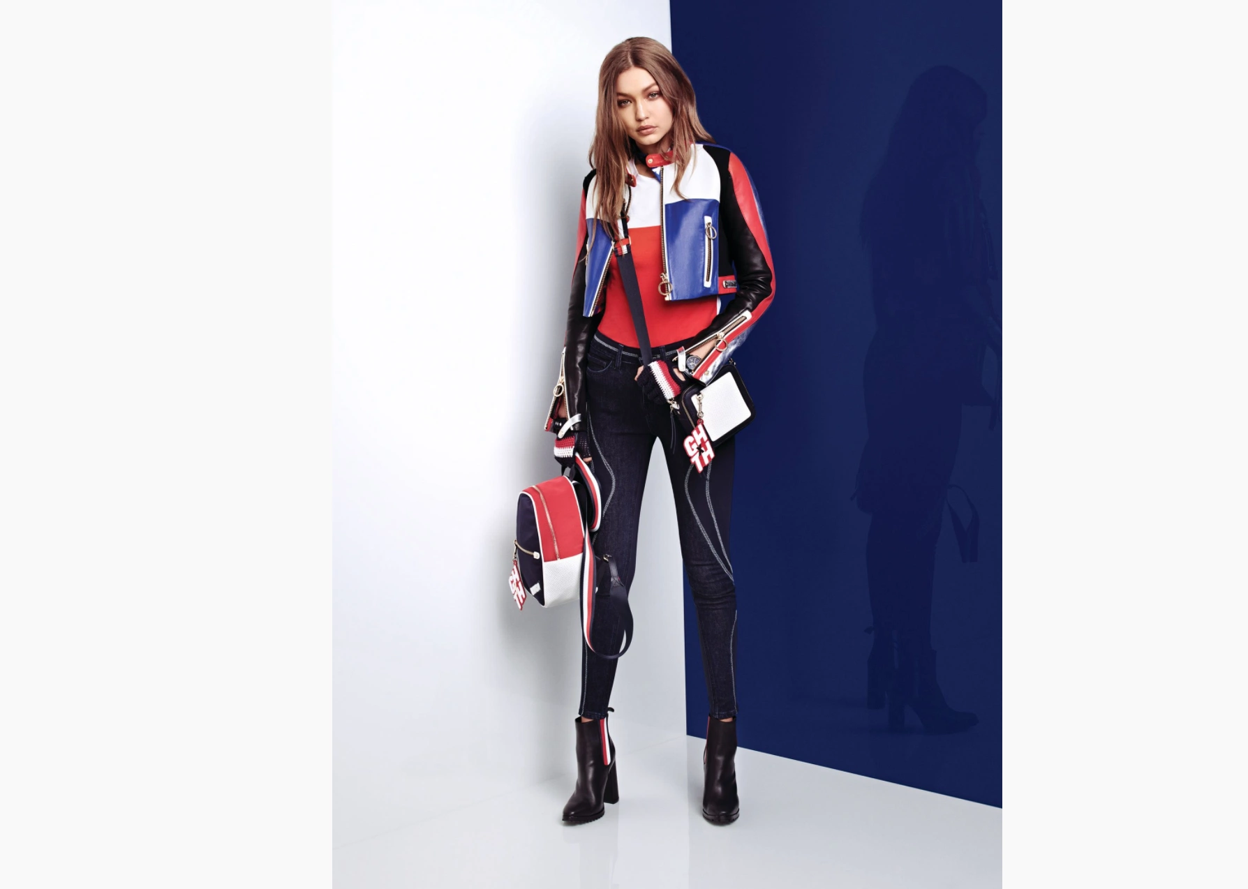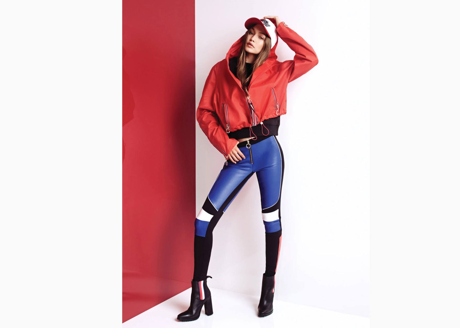 distressed denim. Athletic colour-blocking in red, white and blue is enhanced with a signature Gigi racing stripe print, graphic badges and embroidered speed logos. Gold zipper details and contrasting stitching and piping add a luxurious finishing touch. The silhouette is mix-and-match with oversized pieces combining with super-skinny designs for a strong and confident new take on the race-track style.