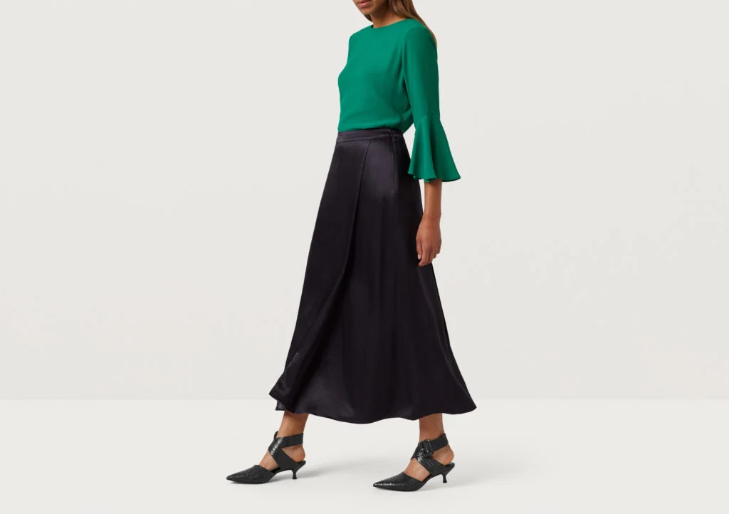 Navy satin wrap skirt, €109 at finerylondon.com