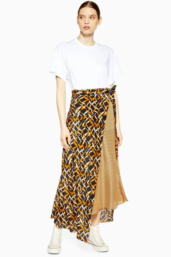 Geometric print silk skirt, Boutique, €117 at Topshop