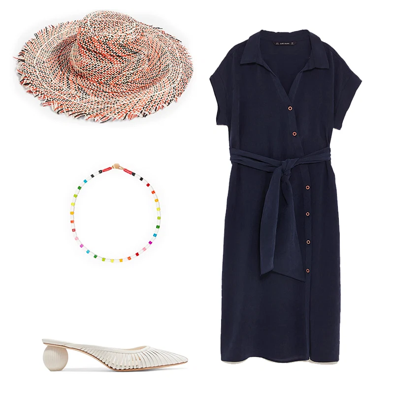 Flowing shirt dress, €39.95 at zara.com, floppy raw edge hat, €20 at topshop.com, fresh start u-tube necklace, €101.13 at roxanneassoulin.com, Alia leather mules by Cult Gaia, €340 at net-a-porter.com
