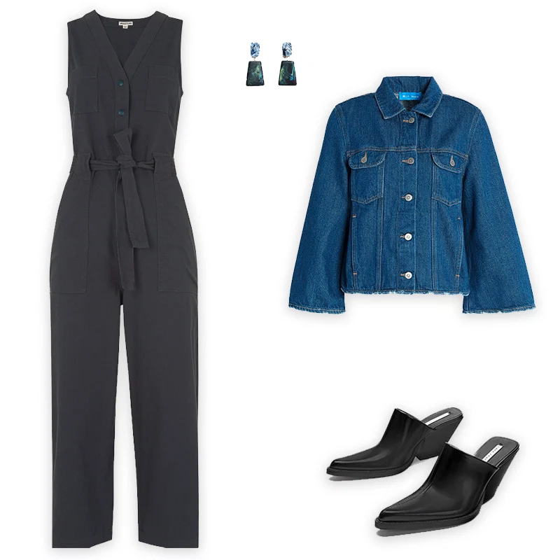 Thandie tie denim jumpsuit, €179 at whistles.com, distressed denim jacket by M.I.H jeans, €130 at theoutnet.com, perspex earrings, €19.95 at mango.com, block heel mules, €49.95 at zara.com