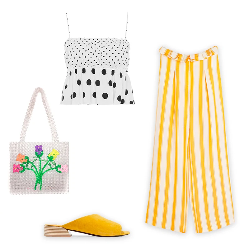 Striped trousers, €99 at uterque.com, mix spot print camisole top, €20 at topshop.com, bouquet bag, €265.43 at susanalexandra.com, Irine suede mules by Mercedes Castillo, €300 at net-a-porter.com
