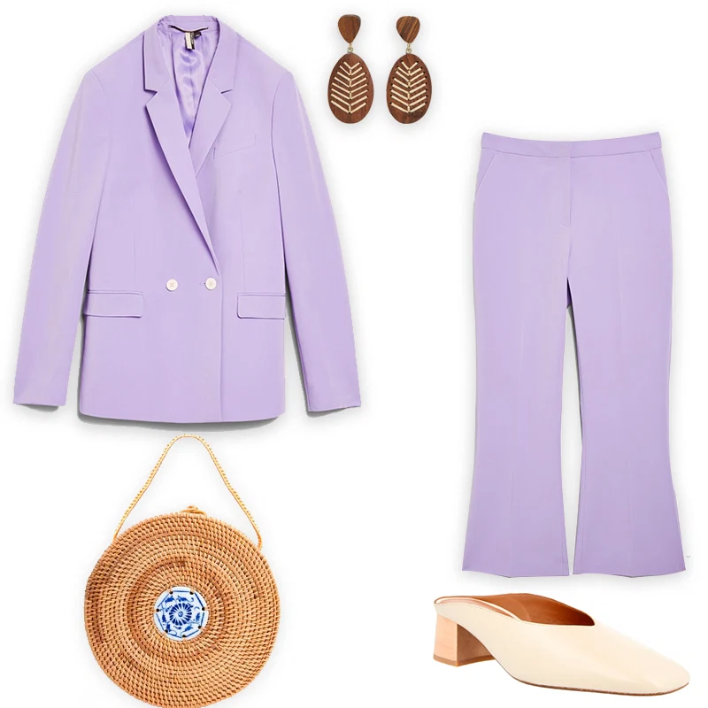 Cropped double-breasted suit, €110 at topshop.com, Ceramic centre round rattan bag, €141.10 at thefrankieshop.com, Karen white leather mules, €375 at byfarshoes.com